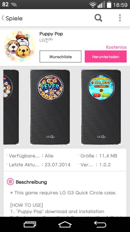 Laut der Aussage von LG „beweist Puppy Pop, dass das QuickCircle Case nicht nur zum Schutz des LG G3 Display gedacht ist“. Verfügbar sein soll das Spiel im Laufe des Tages im Google Play Store und das kostenlos, wie es bei so vielen Apps und vor allem Spielen der Fall ist. Ob noch weitere extra für das QuickCircle Case entwickelte Spiele erscheinen werden ist nicht bekannt, wobei die Aussage „das weltweit Erste seiner Art“ sehr eindeutige Anspielungen macht. Nur wann ist halt die Frage.