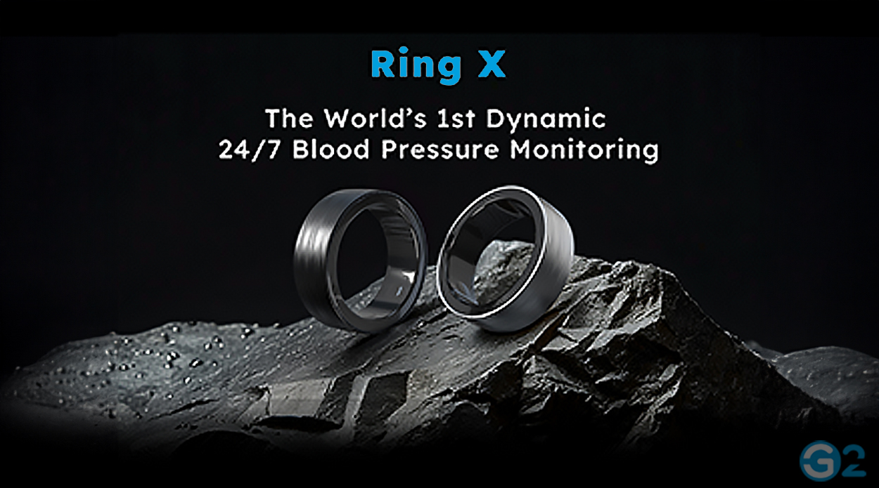 Der Ring X wird als intelligenter Ring beworben, der kontinuierlich den Blutdruck optisch messen kann. Ein begleitendes YouTube-Video zeigt einen Vergleich der Messwerte zwischen einem medizinischen Blutdruckmessgerät und dem Ring X.