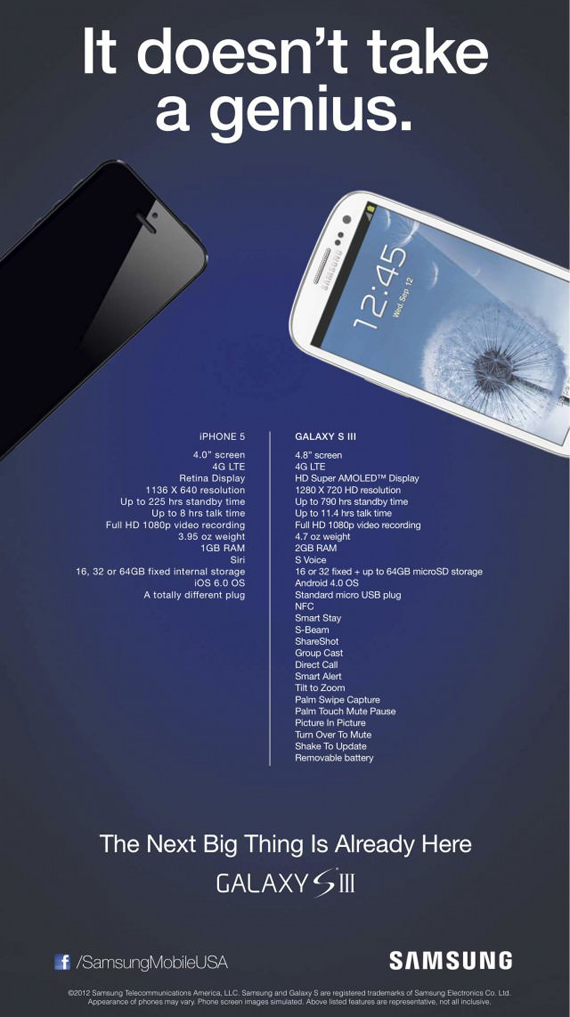 Man könnte hier auch Äpfel mit Birnen vergleichen oder doch nicht? Bei uns erlaubt und in Amerika ausgiebig praktiziert – vergleichende Werbung. Samsung nutzt aktuell in eine Werbekampagne den direkten Vergleich zwischen dem iPhone 5 und ihrem Flaggschiff dem Galaxy S3 LTE. Nun man muss kein Genie sein um heraus zu finden welches der beiden Smartphone hier wohl besser abschneidet.