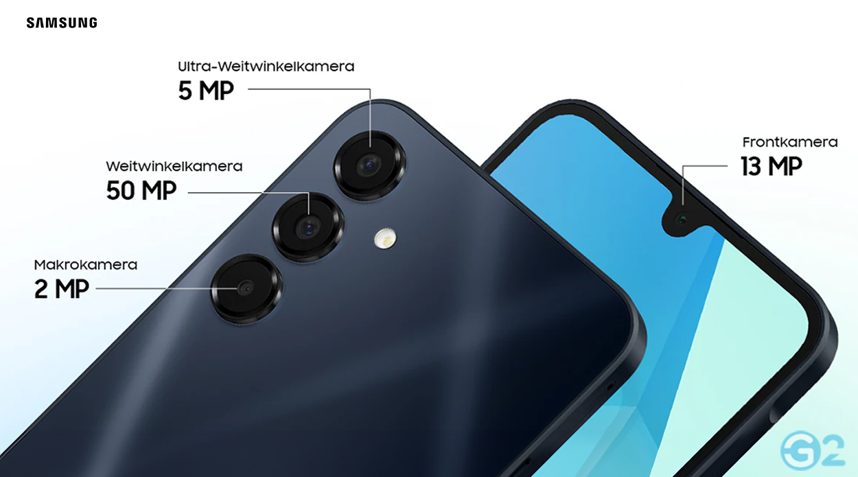 Auf der Vorderseite zeigt sich das Samsung Galaxy A17 mit einem 6,7 Zoll großen AMOLED-Display, das eine tropfenförmige Notch für die Selfie-Kamera aufweist. Die Bildschirmränder fallen vergleichsweise breit aus, insbesondere an der unteren Kinnseite. Die Hauptkamera auf der Rückseite setzt sich aus drei Sensoren zusammen. Darunter eine 50-Megapixel-Haupt-, eine 5-Megapixel-Ultra-Weitwinkel- und eine 2-Megapixel-Makro-Kamera. Diese Kombination bietet eine solide Fotoausstattung im günstigen Preisbereich.