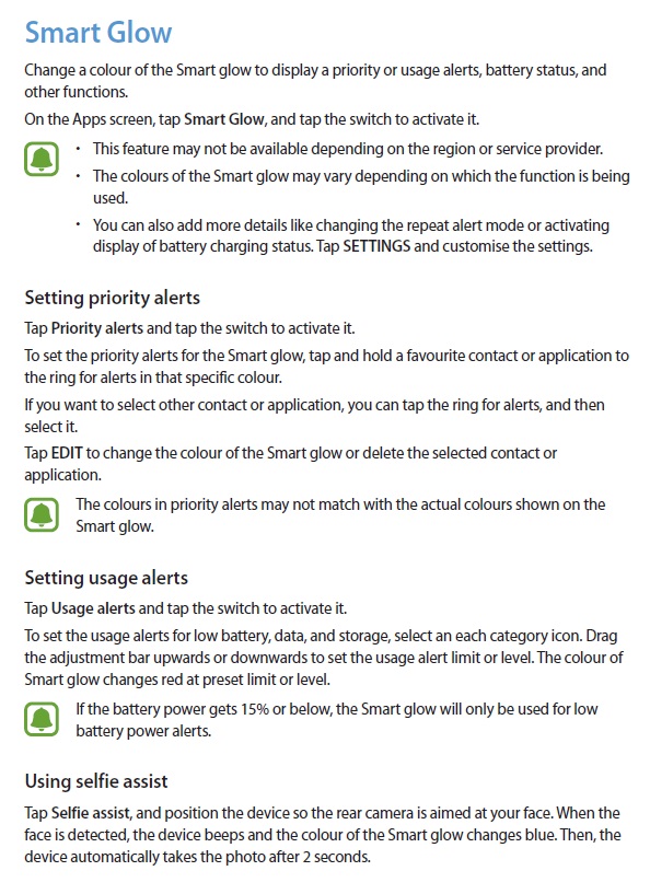 Ebenso unklar ist ob der südkoreanische Hersteller mit Smart Glow die vordere Benachrichtigungs-LED ersetzen will, was unter Umständen nach sich ziehen würde, dass Besitzer eines solchen Smartphone in Zukunft dieses auf das Display ablegen müssten um über eingehende Nachrichten via Smart Glow informiert zu werden.