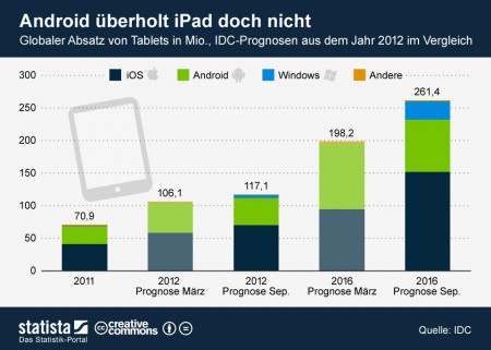 Seit Freitag ist das iPhone 5 von Apple theoretisch in den Läden vor Ort zu haben, sofern die Geräte da nicht schon ausverkauft sind. Satte 5 Millionen will Apple alleine am ersten Wochenende bereits abgesetzt haben, wovon Android-Hersteller derzeit nur träumen können. Ein Grund für die Analysten bei IDC, mal wieder einen Blick in die Pseudo-Glaskugel zu werfen und den Tabletmarkt unter die Lupe zu nehmen.