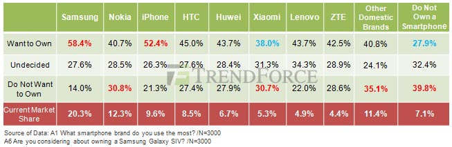 Lediglich 9,6% Marktanteile am chinesischen Mobilfunkmarkt kann der Konzern aus Cupertino für sich beanspruchen, seit der Konzern mit seinem iPhone im Jahre 2009 in China offiziell vertreten ist. Und obwohl viele Chinesen als verrückt nach Apple-Produkten gelten, hat Konkurrent Samsung mit 20,3% auch in China die Nase vorn, was die Marktanteile betrifft. Zumindest wenn man einer neuen Statistik glaubt, welche interessante Details an den Tag bringt. Zwar ist die Umfrage von TrendForce mit knapp 3.000 befragten Personen wieder nur bedingt repräsentativ aber dennoch vielsagend. Denn von den über 3.000 befragten Personen denken über 50% ernsthaft nach, von Apples iPhone zum Galaxy S4 von Samsung zu wechseln.
