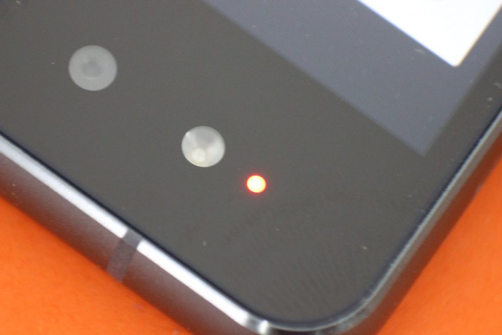 Über dem Display befindet sich wie bei Smartphones üblich der Lautsprecher für Telefonate. Links von diesem sind die Frontkamera mit einem noch überwiegend selten anzutreffenden Front-Blitzlicht verbaut und eine Status-LED, die auf Benachrichtigungen und andere Ereignisse mit verschiedenen Farben aufmerksam macht. Rechts vom Lautsprecher wiederum sind die beiden Sensoren für Helligkeit und Annäherung verbaut, womit das Display bei Telefonaten automatisch ausgeschaltet wird.