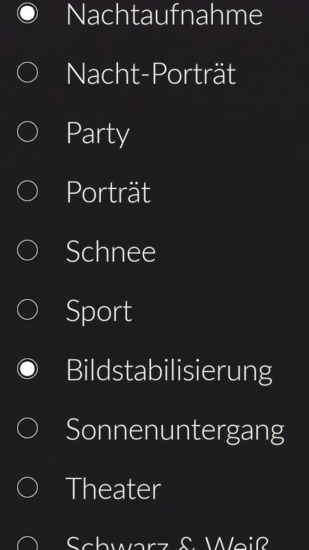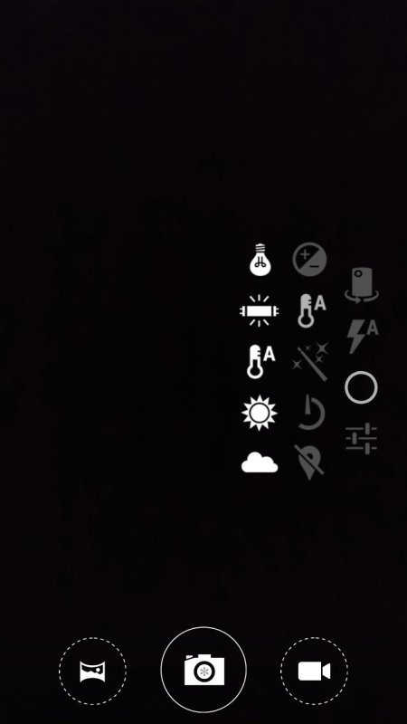 Bei den Icons handelt es sich um einen Wechsler zwischen Front- sowie Hauptkamera, je nach Modus den einschaltbaren LED-Blitz, den Schnellzugriff für einfache Einstellungen (Belichtung, Farbtemperatur, Filter, Timer für eine Aufnahme und dem Geotagging von Fotos) und dem Zugriff auf die allgemeinen Einstellungen.