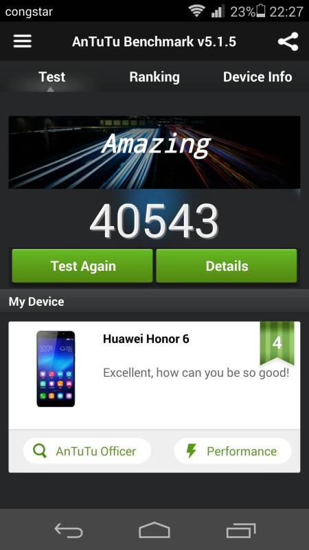 Mit einer Leistung von 40.543 Punkten im AnTuTu v5 Benchmark kann sich das Smartphone durchaus sehen lassen, auch wenn aktuelle Flaggschiffe anderer Hersteller bereits an der Marke von 45.000 Punkten kratzen. Trotzdem ist das HUAWEI Honor 6 wirklich zu jeder Zeit sehr flüssig in der Bedienung. Ruckler oder gar Wartezeiten sind quasi nicht vorhanden und darauf kommt es letztlich mit an. Daran dürfte auch der mit 3 GB sehr großzügig dimensionierte RAM nicht ganz unschuldig sein.