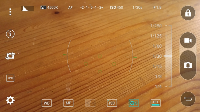 Bei der Kamera-App des LG G4 hat sich der Hersteller hingegen einige Gedanken gemacht. Startet man die Kamera, sind alle wichtigen Bedien-Elemente zur Aufnahme und für die wichtigsten Einstellungen direkt verfügbar. Kennt man schon von anderen LG-Smartphones wie eben auch dem LG G Flex 2. Was allerdings einer besonderen Erwähnung bedarf, ist der manuelle Modus: Dieser fällt enorm umfangreich aus mit Weißabgleich, ISO-Wert, Belichtungskorrektur, Belichtungszeit und einer virtuellen Wasserwaage, um die richtige Position für die Aufnahme zu finden. Im manuellen bzw. Experten-Modus des LG G4 lässt auch der Fokus Stufenlos verändern, falls man mit der Automatik nicht zufrieden ist. Man könnte fast meinen, dass sich LG bei professionelleren Digitalkameras etwas abgeschaut hat. Selbst ein kleines Histogramm findet sich in der linken oberen Ecke wieder. Auch dir RAW-Daten lassen sich nachträglich wie bei einer Profi-Kamera nachträglich mit entsprechender Software bearbeiten.
