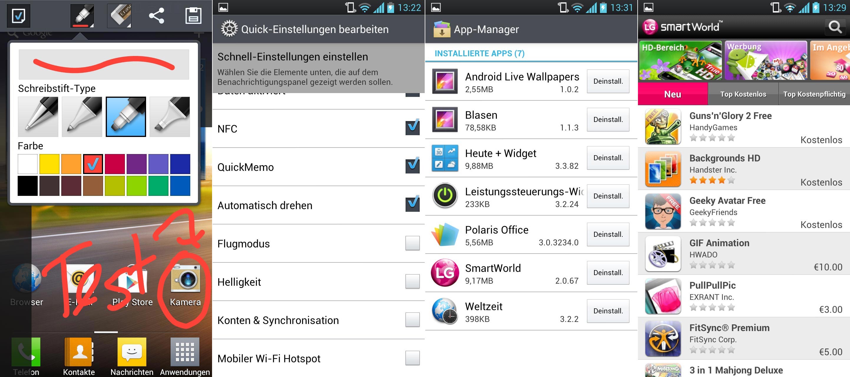 Die Tastatur ist wie beim kleinen Bruder Optimus L7 wieder recht angenehm groß gestaltet. Nur ist die Erkennung nicht immer gut, sodass ein Verschreiben fast schon unausweichlich ist. Zudem hat das mir vorliegende Gerät nicht immer neue Wörter gelernt, sodass das Schnellschreiben manchmal eine regelrechte Qual war. Abgesehen davon schreibt es sich mit der Tastatur angenehm schnell. Erwähnenswert ist Des Weiteren die von LG QuickMemo genannte Funktion, vom Bildschirminhalt einen Screenshot zu machen und sofort diesen mit Notizen zu versehen. Das sowie die editierbare Schalterleiste in der Drop-Down-Bar der Notification-Leiste gibt es bisher vorinstalliert nur bei LG und weiß im Alltag wirklich durch seinen praktischen Nutzen zu überzeugen.