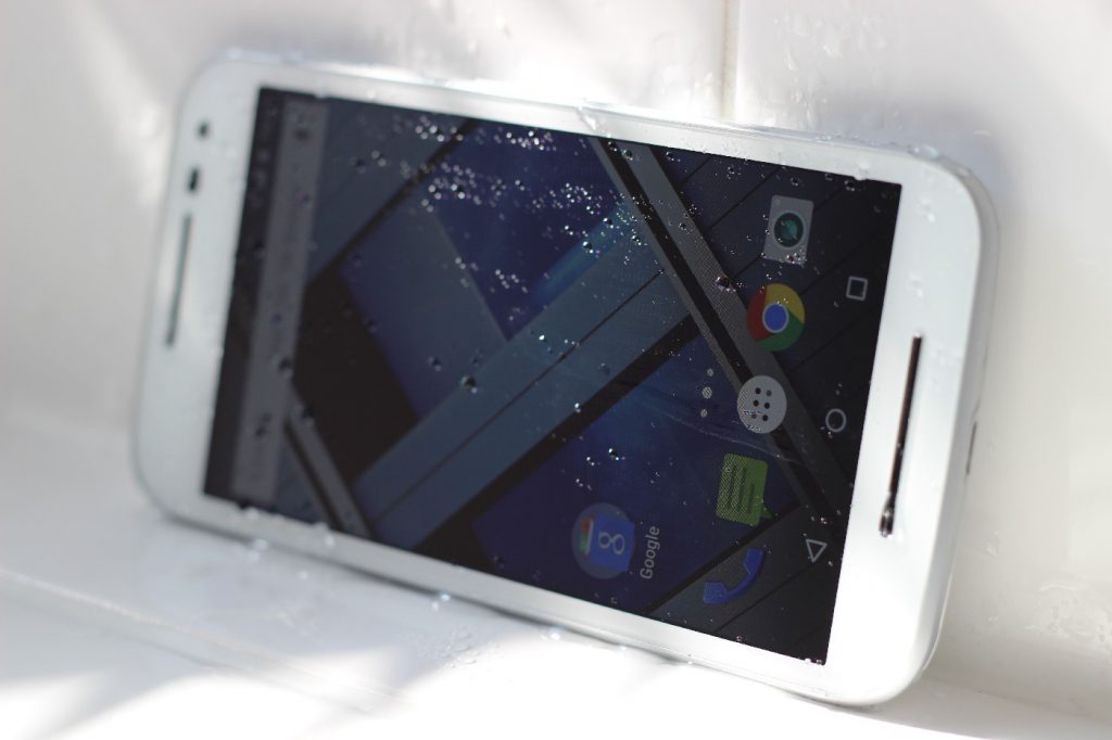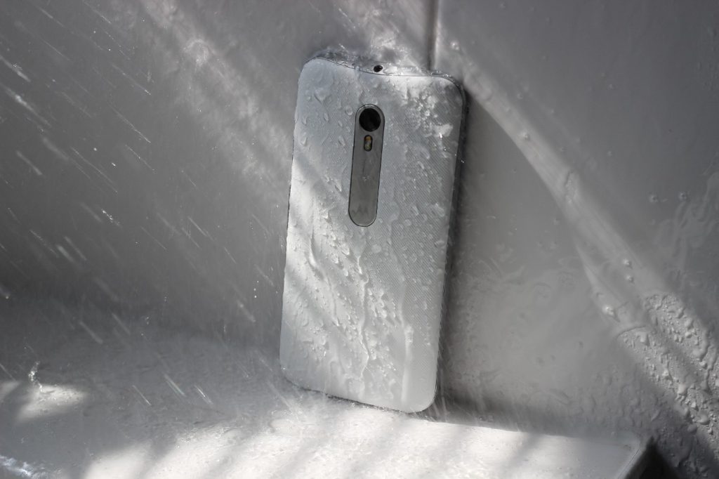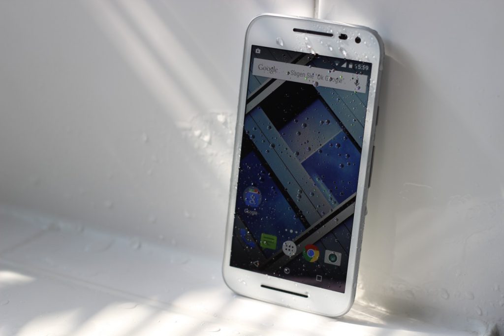 Das heißt jetzt aber nicht, dass man das Motorola Moto G 2015 tatsächlich aktiv zum Schnorcheln mitnehmen kann. Vielmehr übersteht das Motorola Moto G (3. Gen.) den Sturz in eine Wasserpfütze, in ein Bierglas mit anschließender Dusche zur Säuberung oder auch den Taxi-Anruf im strömenden Regen. Immer unter der Prämisse, dass der Akkudeckel auch wirklich richtig fest auf dem Gerät sitzt, was insbesondere um die Kamera herum eine etwas schwierigere Angelegenheit sein kann.