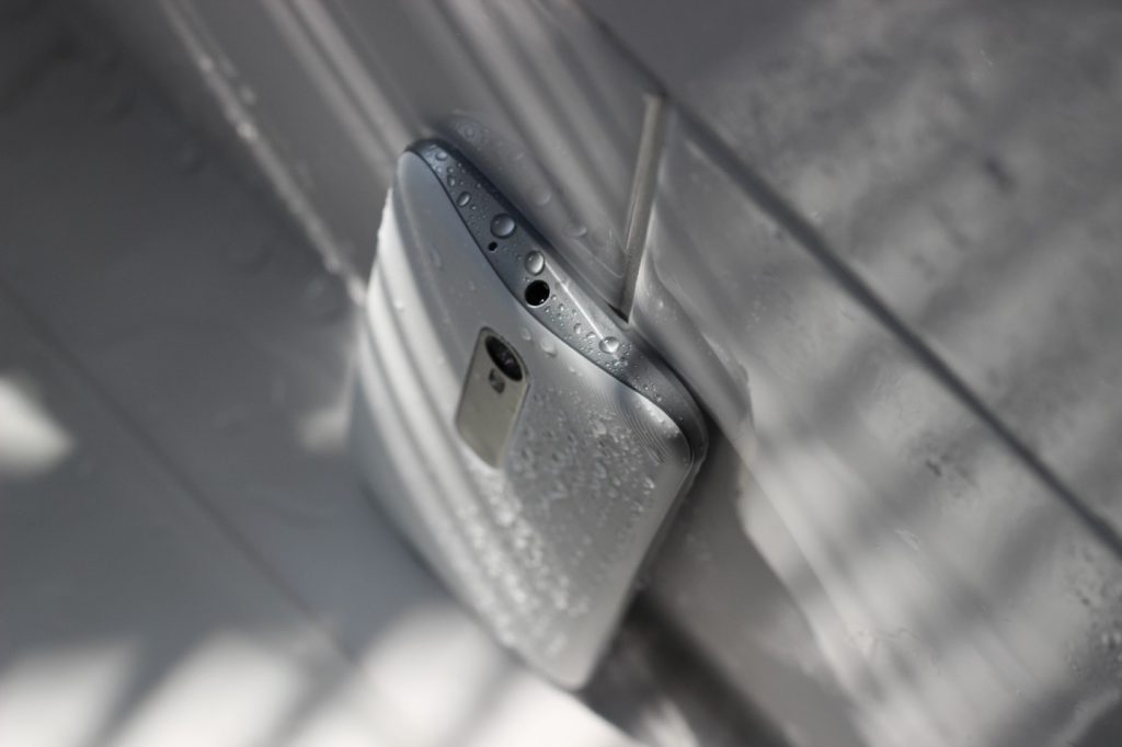 Das Geheimnis der Rückseite offenbart sich erst, wenn man diese abnimmt. Genau dann fallen die beiden gummierten Noppen auf, denn das Motorola Moto G 2015 hat eine Besonderheit: Es ist Wasserdicht. Genau genommen nur bis maximal 1 Meter Wassertiefe bei ebenfalls maximal 30 Minuten laut der IPX7-Zertifizierung. Davon ausgeschlossen sind allerdings Salzwasser, mit Chlor und jegliches andere mit chemischen Zusätzen versetztes Wasser. Das schließt auch Seife mit ein.