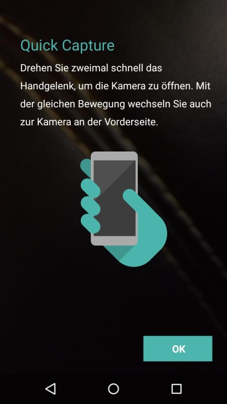 Unter anderem lassen sich dort der automatische HDR-Modus deaktivieren, das Blitzlicht – bei welchem es sich um eine zweifarbige LED für verschieden warme Blitzlichter handelt – Standortdaten, den kaum hilfreichen Restlichtmodus oder auch die Geste zum Schnellstarten der Kamera. Denn wie das große Modell Moto X beherrscht auch das kleinere Motorola Moto G 2015 die Handgesten für bestimmte Aktionen. Dreht man sein Handgelenk mit dem im Standby befindlichen Smartphone zweimal kurz, wird automatisch die Kamera gestartet.