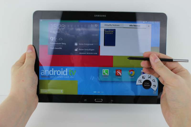 Wenn man sich darauf einlässt will man sie nach ein paar Tagen nicht mehr missen. Erfreulicherweise sind die kapazitiven Tasten mit dem S-Pen bedienbar. Apropos S-Pen: Dieser ist im Vergleich zum ersten Tablet der Galaxy-Note-Familie – dem Galaxy Note 10.1 – deutlich flacher und schlanker geworden. Das wirkt sich leider etwas negativ auf die Stabilität des neuen S-Pen aus. Übrigens ist es bei dem Galaxy NotePRO 12.2 egal wie herum man den S-Pen ins Gehäuse schiebt, was bei der ersten Tablet-Generation noch ganz anders war.