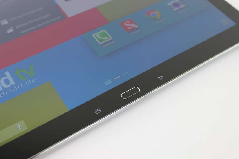 Auf der Oberseite des Tablets sind linkerhand die Power-Taste sowie Lautstärke-Wippe verbaut und in der Mitte der für die besseren Tablet-Modelle von Samsung typische Infrarot-Port. Die Tasten selbst erwecken einen gemischten Eindruck. Während die Lautstärke-Wippe ordentlich zu erfühlen ist und einen sehr guten Druckpunkt besitzt, ist die Power-Taste eher das Gegenteil: Schwer zu erfühlen (gerade beim blinden einschalten des Galaxy NotePRO 12.2) und ein etwas schwammiger Druckpunkt. Etwas unverständlich wie die Qualität dermaßen gegensätzlich sein kann so direkt beieinander. Weitere Tasten besitzt das Galaxy NotePRO 12.2 auf der Front selbst, unterhalb des riesigen Displays. Dort findet sich eine Home-Taste wieder, die rechterhand von einer kapazitiven Taste für Zurück flankiert wird und linkerhand für den Task-Manager. An die Tasten selbst muss man sich erst gewöhnen, zumal solch eine Steuerung für ein Tablet mehr als ungewohnt ist.