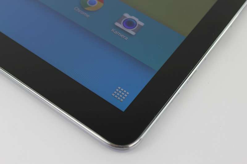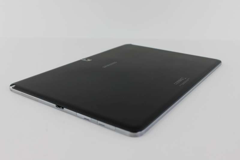Diese Größe hat allerdings auch ein paar Nachteile auf den ersten Blick. Der erste Nachteil wäre ein hohes Gewicht von über 750 Gramm, die allerdings in Relation zur Größe des Tablets so schwer nicht sind. Dennoch ist auf Dauer das Halten mit zwei Händen oder auf dem Schoß zu empfehlen. Vor allem aufgrund der nicht allzu hohen Verwindungssteifheit des Gehäuses: Hält man es mit nur einer Hand an einer der kürzeren Seiten dann biegt sich das Tablet etwas unschön. Hier hätte ein Rahmen aus echtem Metall wie Aluminium eventuell gute Abhilfe geschaffen. Denn auch wenn es so aussieht: Der Rahmen um das Galaxy NotePRO 12.2 herum ist Polycarbonat im Chrom-Look. Ein Markenzeichen des Samsung-Designs, welches mit der Generation Galaxy S4 eingeführt wurde.