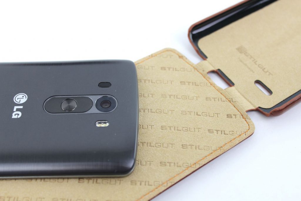 Die Außenfläche des StilGut UltraSlim Leather Case ist in Cognac-Braun gehalten, während die Innenfläche mit einem helleren Mikrofaserstoff zur automatischen Reinigung des Displays versehen ist. Die Nähte sowie Ränder der Ledertasche sind allesamt sauber gearbeitet und geben keinen Grund zur Beanstandung. Das LG G3 selbst sitzt sehr fest in dem Case, ohne das es irgendwo störende Übergänge vom Smartphone zur der Ledertasche gibt.