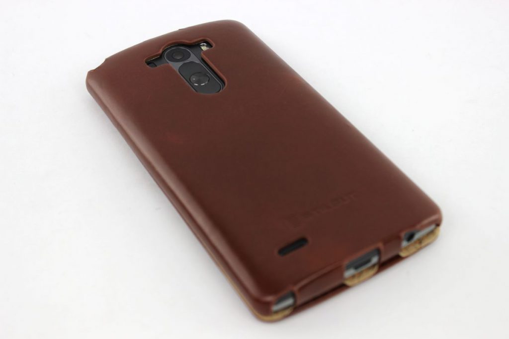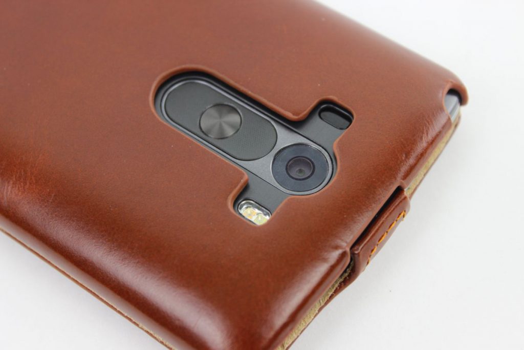 Ein Muss für eine solche Tasche sind natürlich die freien Stellen, um alles Wichtige des zu schützenden Gerätes ohne Hindernisse erreichen zu können. So sind auf der Unterseite der Ledertasche großzügige Freistellen für den MicroUSB-Port sowie die 3,5 mm Audio-Buchse vorhanden. Auch für den Lautsprecher sowie die Kamera nebst LED-Blitzlicht, Infrarot-Sensor für den Laser-Autofokus und die LG-typischen Rear Keys haben ihre eigenen Ausschnitte in der Hülle, sodass deren Nutzung nicht eingeschränkt wird.