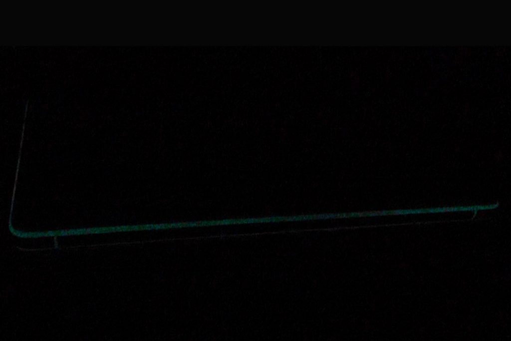 Im Trend liegt zudem nach wie vor 2.5D gebogenes Glas was nichts anderes bedeutet, dass die schützende Glasschicht zum Teil leicht gebogen in den Rahmen übergeht. Man fühlt es mehr als das man es tatsächlich sehen kann. Allerdings geht das Glas nicht direkt in den Metallrahmen über, denn dazwischen liegt noch etwas Kunststoff. Aus gutem Grund: Dieser ist fluoreszierend und leuchtet bei entsprechender Bestrahlung im Dunkeln. Hört sich toll an, sieht auf den Pressebildern klasse aus und ist in echt aber enttäuschend. Das liegt vor allem daran, dass man das Smartphone verdammt lange anstrahlen muss, damit das grünlich-gelbe Licht im Dunkeln zum Vorschein kommt. Dann hält es zwar stundenlang, ist aber auch nur in ganz dunkler Umgebung zu erkennen, was uns vor einer nahezu unlösbare Aufgabe gestellt hat, das gesamte Szenario in einem Bild festzuhalten. Insofern ist es mehr ein witziger Party-Gag im Darkroom, denn ein nützliches Feature.