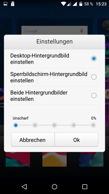 Was jedoch umfangreich ausgebaut wurde ist der Homescreen Launcher. Zum einen fehlt diesem der sonst Android-typische App Drawer – Wiko orientiert sich in diesem Punkt wie etliche Konkurrenten aus China ebenfalls an iOS – und zum anderen bietet er einige Möglichkeiten zur optischen Anpassung. Erwähnenswert sei an dieser Stelle, dass man ein beliebiges Hintergrundbild auf dem Wiko FEVER 4G mit einem Blur-Effekt in fünf Abstufungen versehen kann.