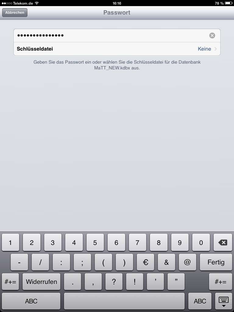 - Hier wählen wir die App MiniKeePass aus, die sich dann auch umgehend mit unsere Datenbank öffnet und auf das Master-Passwort oder der entsprechenden Schlüsseldatei wartet.