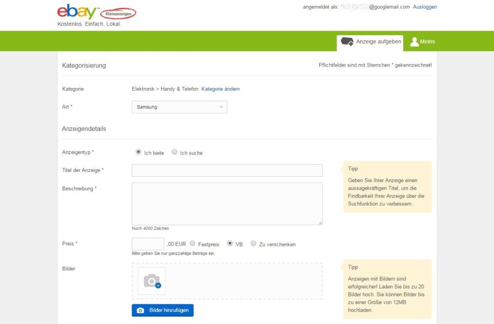 Sicherer, da man hier selber entscheiden kann an wen man sein Android Smartphone verkaufen will, ist ebay Kleinanzeigen. Dort kann man (einen kostenlosen Account vorausgesetzt) Anzeigen für fast alle Arten von Produkten, ohne irgendwelche Gebühren einstellen. Mit kostenpflichtigen Zusatz-Optionen zwischen 3,95 und 39,95 Euro kann man seine Anzeige zudem optisch hervorheben oder an besonders prominenter Stelle anzeigen lassen.
