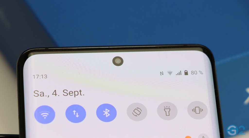 Auf der Front befindet sich oben mittig eine 32-Megapixel-Punch-Hole-Kamera. Auch hier wie bei der Hauptkamera eine äquivalente Brennweite von 26 Millimeter. Die Blende beträgt allerdings „nur“ f/2.45. Ist also nicht so lichtstark wir der 48-Megapixel-Sony-Sensor. Denn auch hier kommt ein Samsung-Sensor zum Einsatz, jedoch ein Samsung ISOCELL S5KGD1.
