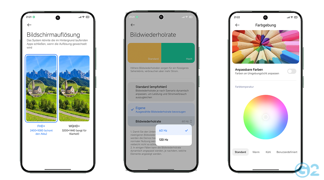 Die maximale Helligkeit ist also da, ausreichend Kontrast und Farbintensität auch. Standard mäßig sogar ein wenig Zuviel. Aber Xiaomi bietet hier von Hause aus eine Menge Eistellungsmöglichkeiten. Sowohl die Farbwerte, als auch die Auflösung und die Bildwiederholrate kann nach eigenen Wünschen und Energiehaushalt feinjustiert werden. Ein Always-on-Display mit den HarmonyOS typischen Einstellungsmöglichkeiten, sind auch beim Ultra gegeben.