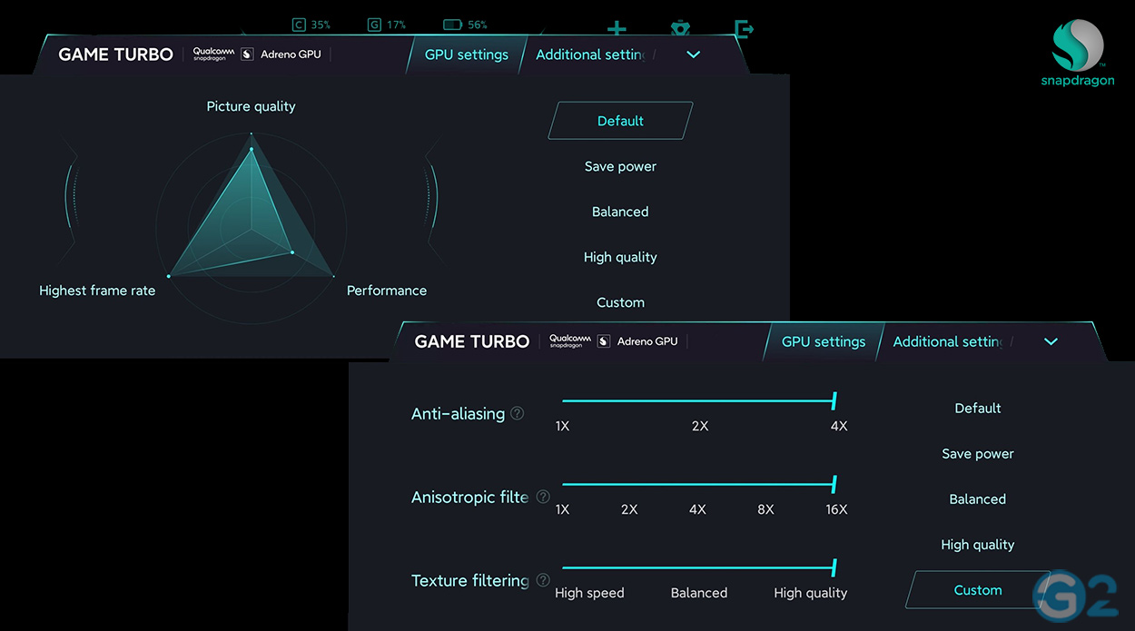 Wie auf den Bildern zusehen, lassen sich hier die Bildqualität, Anti-Aliasing, Anisotropic- und Texture-Filter einstellen. Praktisch die Bild-Eigenschaften wie Tiefenschärfe bei unterschiedlichen Betrachtungswinkeln. Ein weiteres Menü der Anwendung scheint auch das Verhältnis zwischen Bild-Qualität, Performance und Bildwiederholrate zu regulieren. Somit könnte man in der Tat die Taktrate der GPU hochtakten. Von einem solchen Feature haben wir zuletzt in Verbindung mit Nubia Red Magic 5S gehört. Das Gaming-Smartphone welches exakt mit dem RedMagic 5G übereinstimmt, sich aber ebenfalls hochtakten lässt.