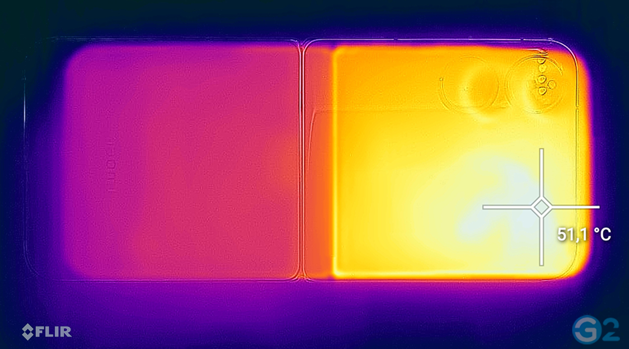 Foldables kämpfen aufgrund ihrer kompakten Bauweise oft mit Problemen bei der Kühlleistung. Das führte in unserem Test zu leichten Erwärmungen von 51,1 Grad Celsius recht neben den beiden Kameras. Und eigentlich noch viel schlimmer: Zu dramatischen Thermal Throttling.