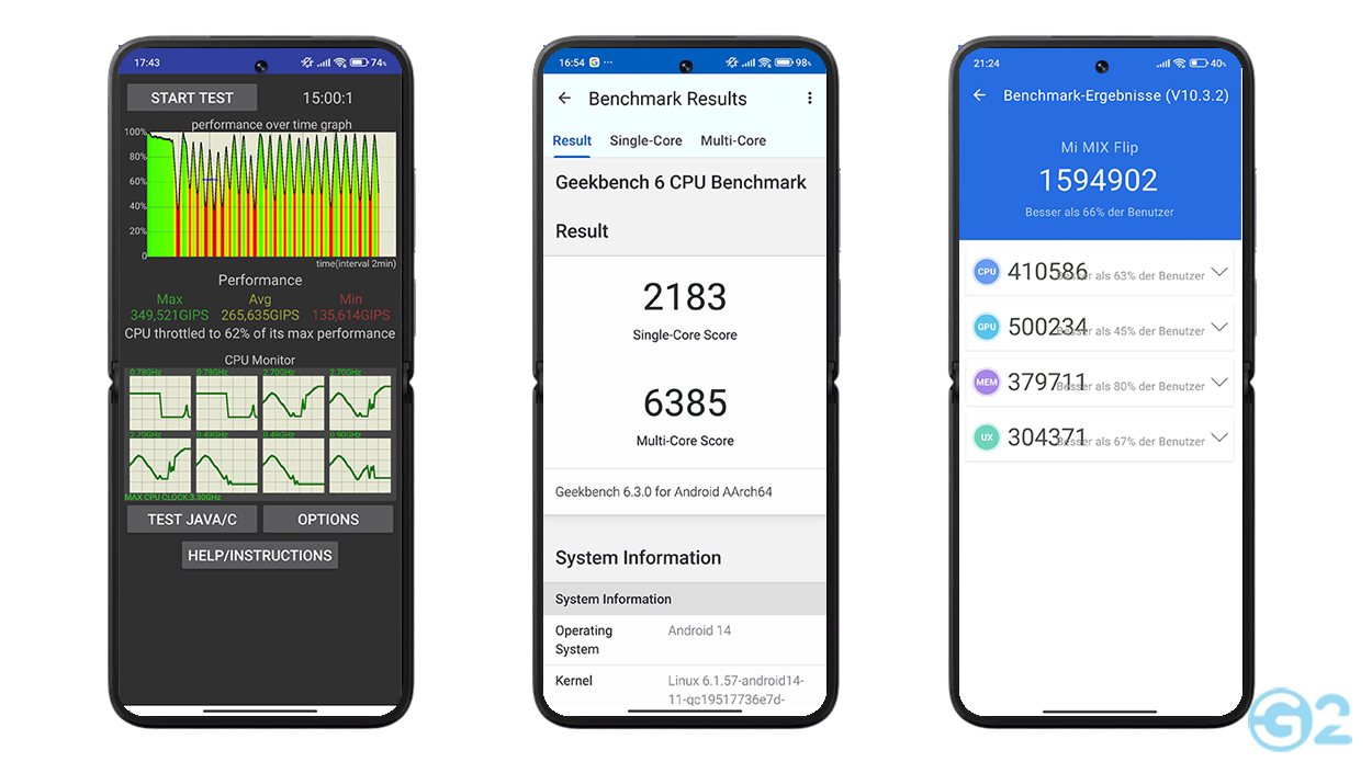Also gibt es bei uns natürlich noch einen Geekbench- und AnTuTu-Benchmarktest. In diesem erzielte das Mix Flip 2.183 im Single- und 6385 Punkte im Multi-Core-Test. Zum Vergleich: Das Motorola Razr 50 Ultra (zum Test) erzielte dagegen deutlich schlechtere 1.904 und 4.671 Punkte. Hat allerdings auch einen schwächere Snapdragon 8s Gen 3 verbaut. Der AnTuTu spülte satte 1.594.902 Punkte für das Xiaomi-Foldable ans Tageslicht.
