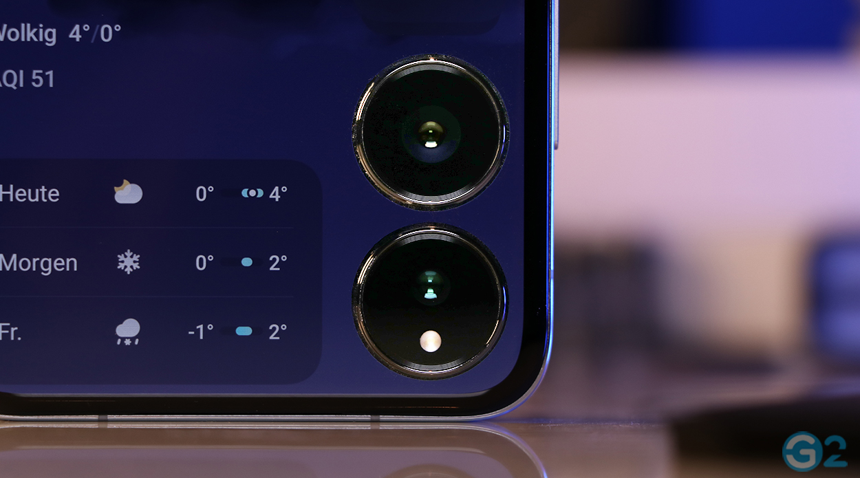 Auffällig sind die großen Kameralinsen, die nur 2 Millimeter aus dem geschickt um die Kameras geführten AMOLED-Cover-Display herausragen. Das moderne Erscheinungsbild wird durch schmale, symmetrische Displayränder und das Seitenverhältnis von 21,4:9 unterstrichen, auch wenn die Punch-Hole-Notch Geschmackssache bleibt.