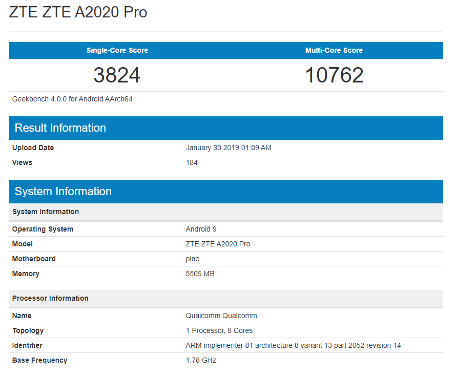 Unterschiedliche Quellen füttern uns mit Informationen zu neuen Smartphones des für eine Zeit aus dem Verkehr gezogenen chinesischen Hersteller ZTE. So ist die Datenbank von Geekbench die Quelle für ein ZTE A2020 Pro, welches wir aufgrund der Modell-Bezeichnung als Nachfolger des A2019G Pro – also dem ZTE Axon 9 Pro – einordnen würden. Das mutmaßliche ZTE Axon 10 Pro erreichte dabei einen Single-Core-Ergebnis von 3.824 Punkten und im Multi-Core-Score 10.762 Punkte. Daraus und der Angabe eines Octa-Core-Prozessors und dessen Rechnerarchitektur, vermuten wir einen verbauten Snapdragon 855. Der Score liegt leicht über dem 999 Euro teuren Samsung Galaxy S10+.
